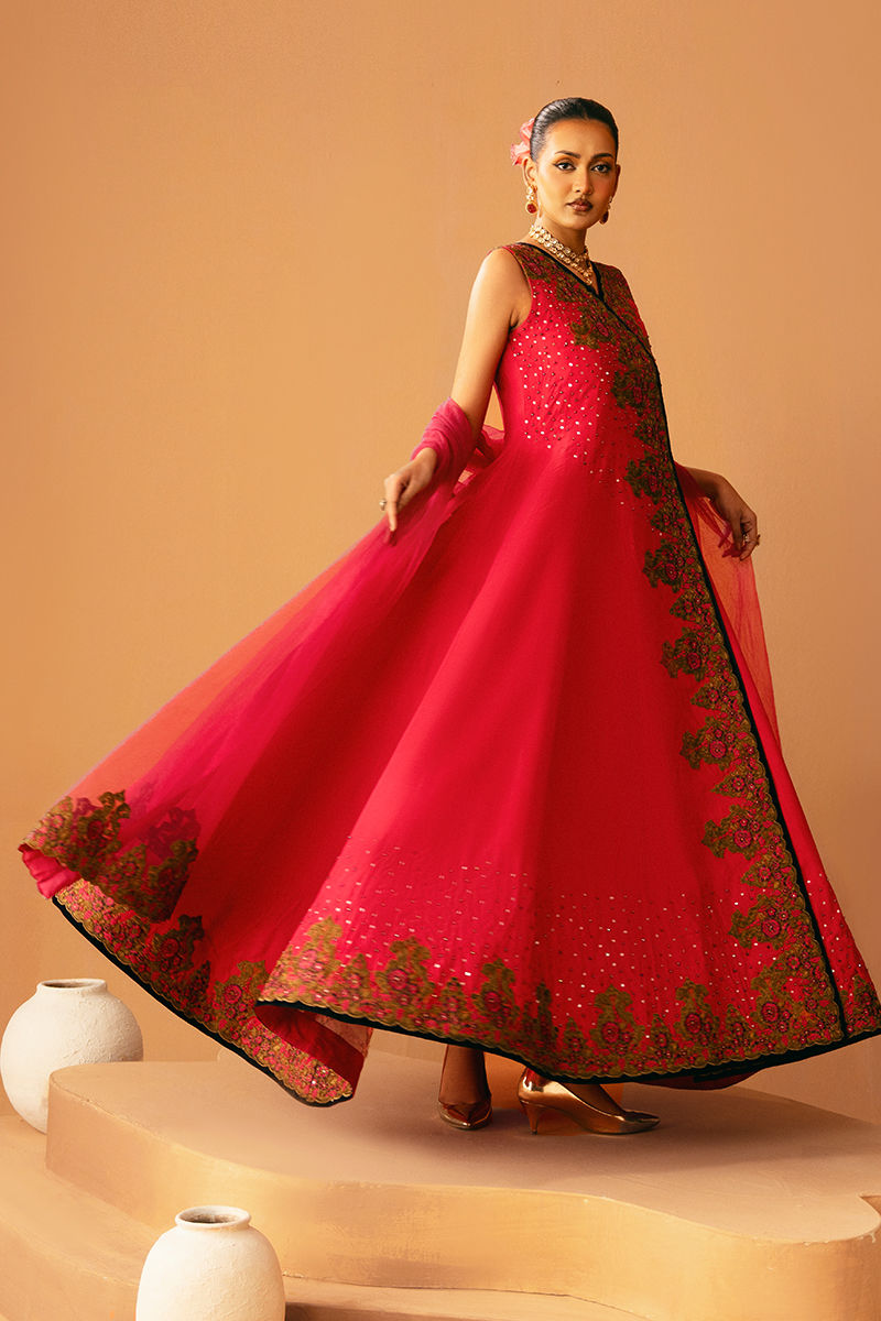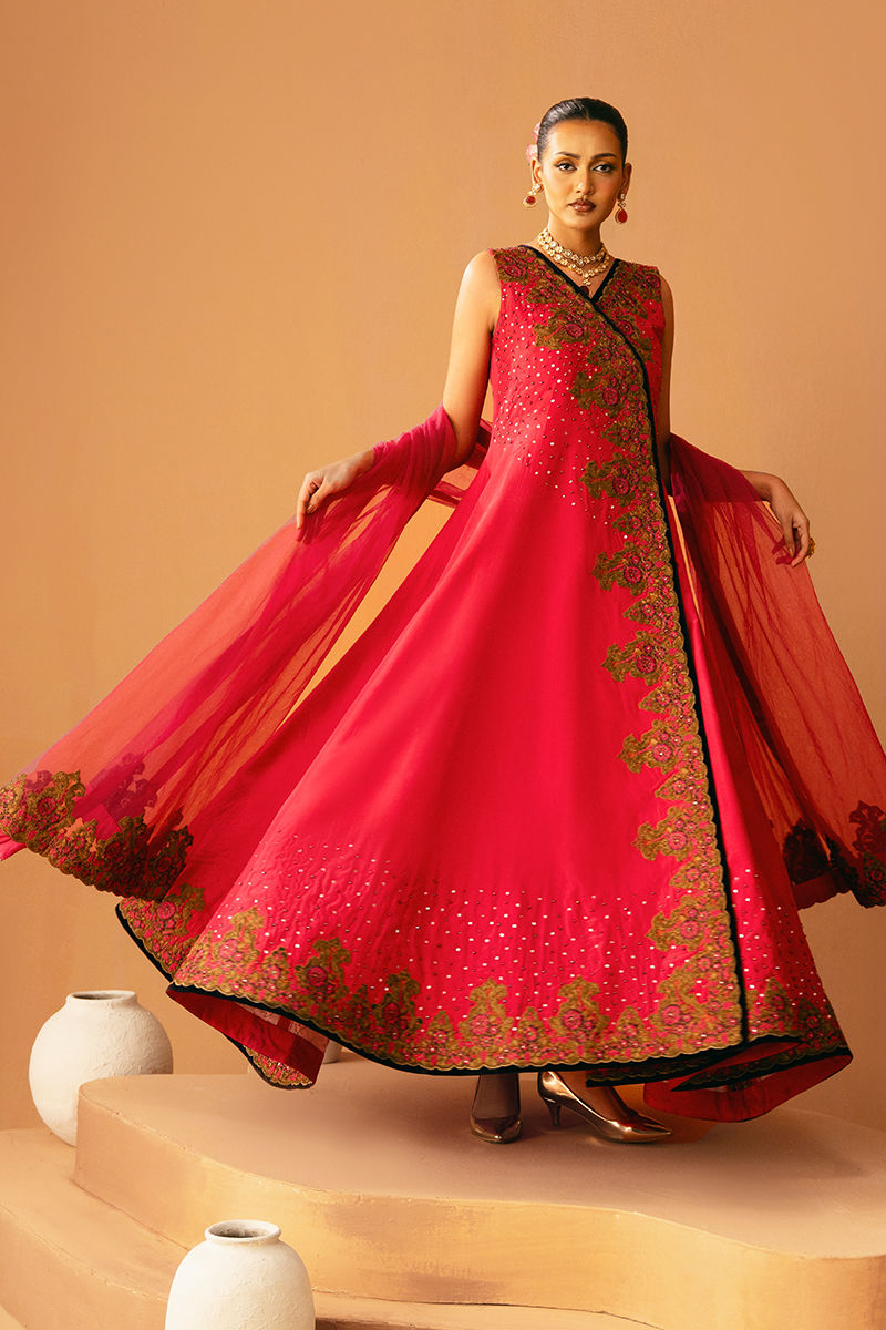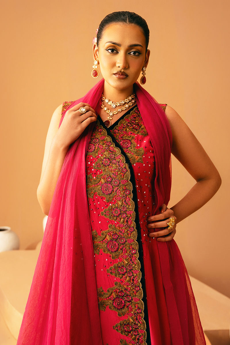 This graceful pink pishwas is fully embroidered and embellished, radiating elegance with every detail. It is paired with matching trousers and a coordinating dupatta, creating a cohesive and festive-ready ensemble that blends traditional charm with luxurious craftsmanship.