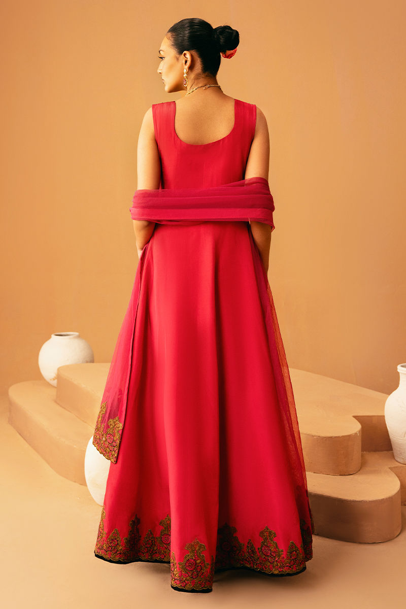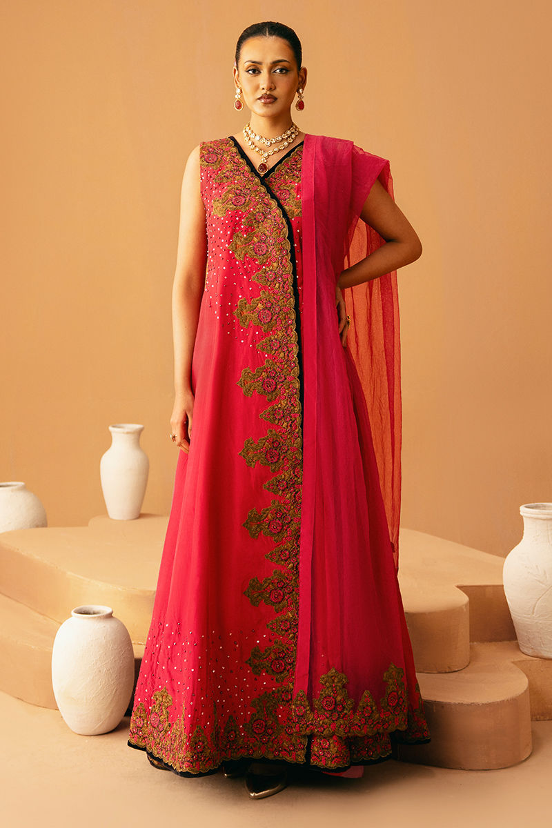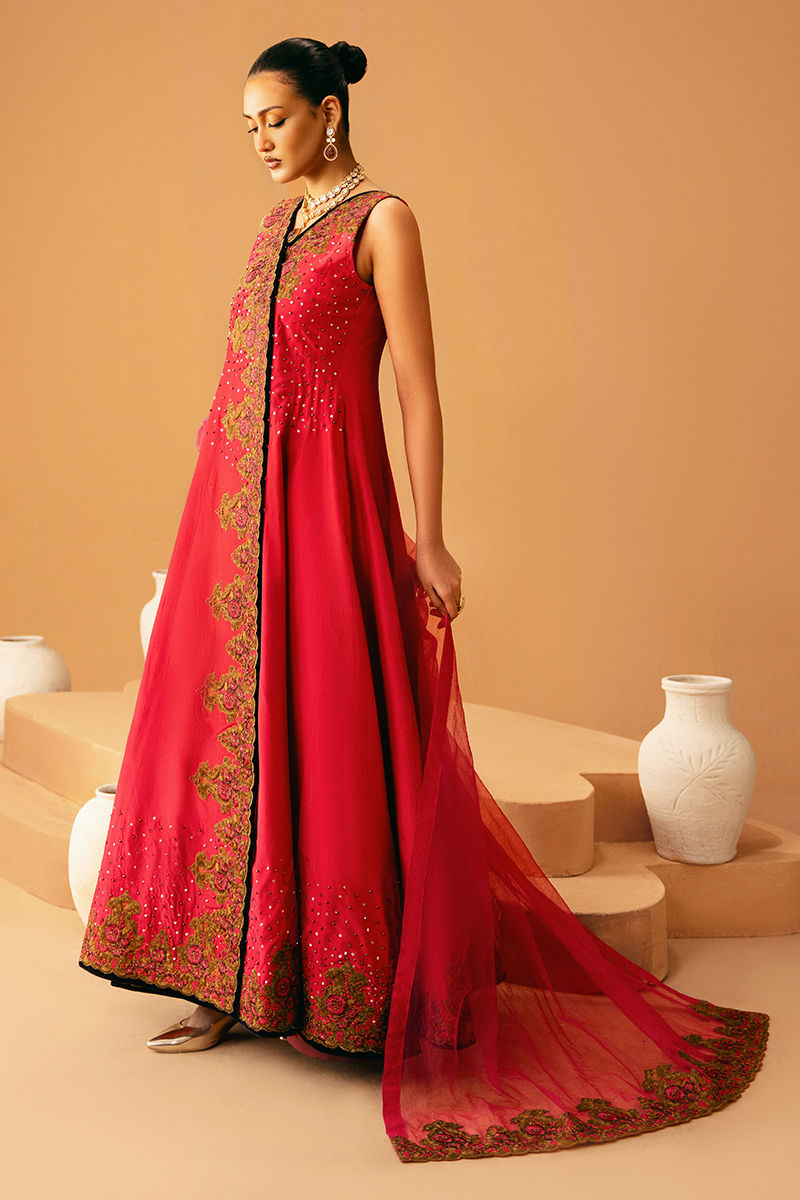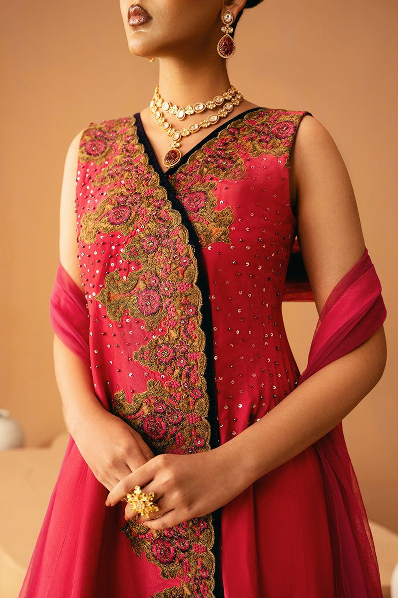 This graceful pink pishwas is fully embroidered and embellished, radiating elegance with every detail. It is paired with matching trousers and a coordinating dupatta, creating a cohesive and festive-ready ensemble that blends traditional charm with luxurious craftsmanship.
