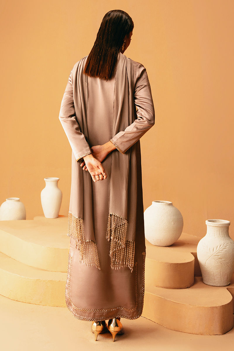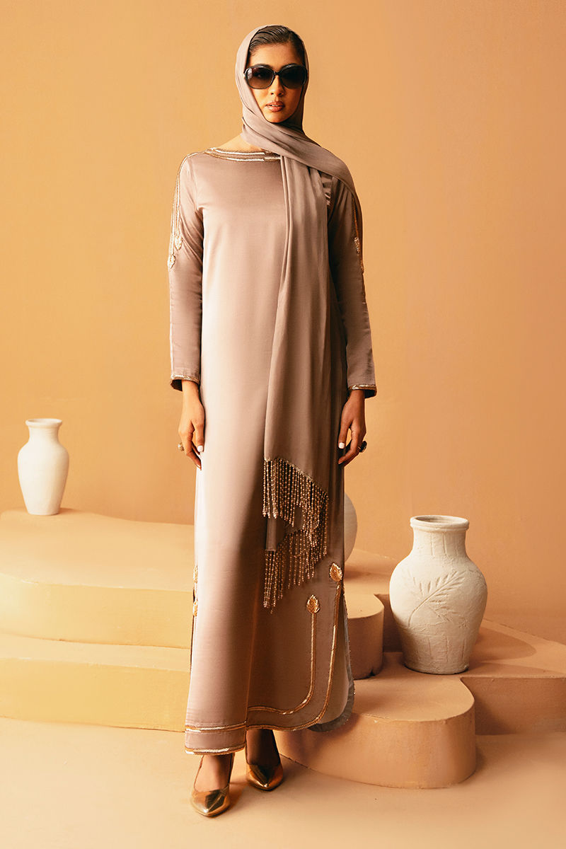 This elegant kaftan is crafted with a focus on intricate embellishments, offering a graceful and luxurious silhouette. Designed for effortless sophistication, it can be paired with a coordinating scarf to complete the look, adding a touch of refined charm and versatile styling for festive or formal occasions.