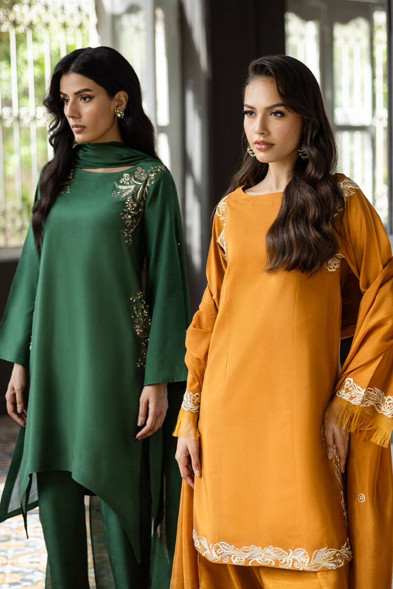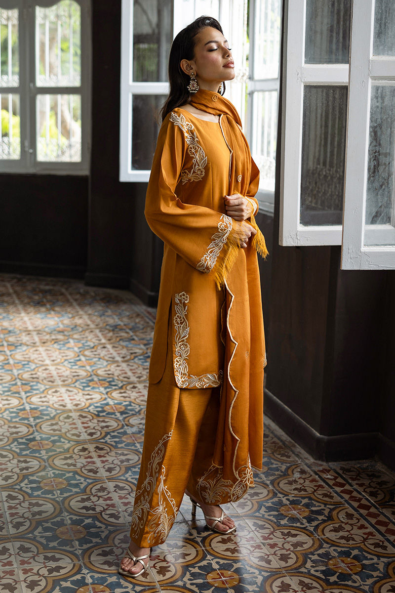 Luxurious silk shirt meticulously adorned resham embroidery & organza fringes on sleeves; paired with embroidered raw silk Shalwar and embroidered amur silk dupatta