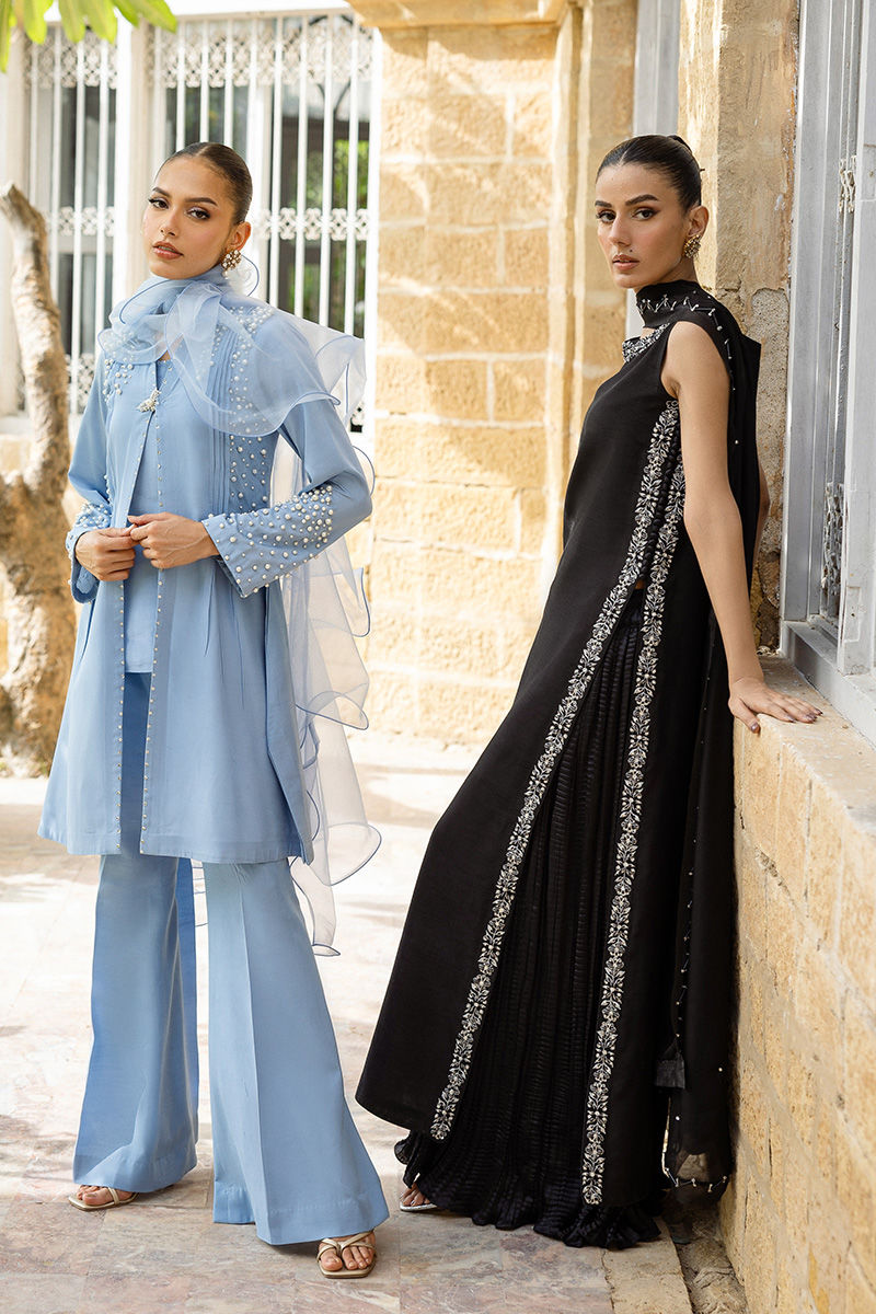 Baby blue front-open georgette collared shirt with pearl embellishment detail on sleeves, collar & shoulder; and baitki embellishment detail on front opening. Paired with boot-cut pants & organza frill dupatta