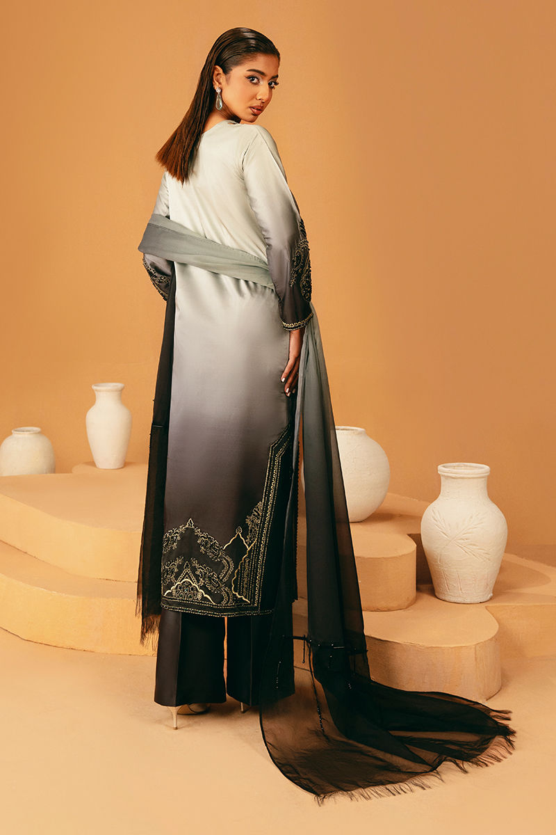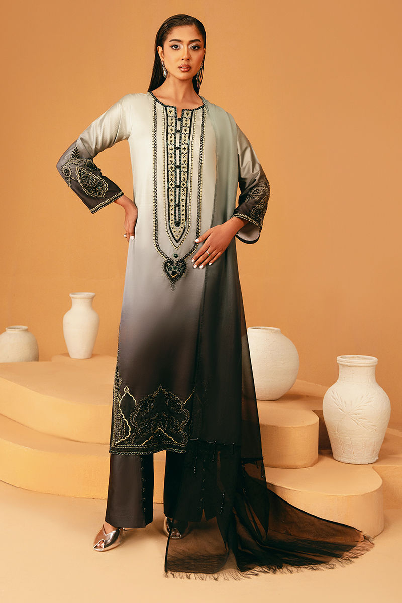 This stunning green-to-black ombre shirt is embroidered and embellished for a striking, contemporary look. It is paired with matching trousers and completed with an ombre dupatta that echoes the gradient tones of the shirt, creating a harmonious, elegant ensemble perfect for festive and formal occasions.