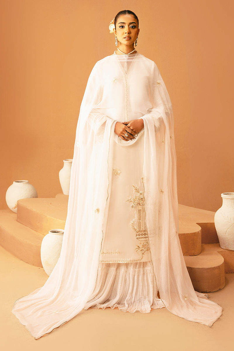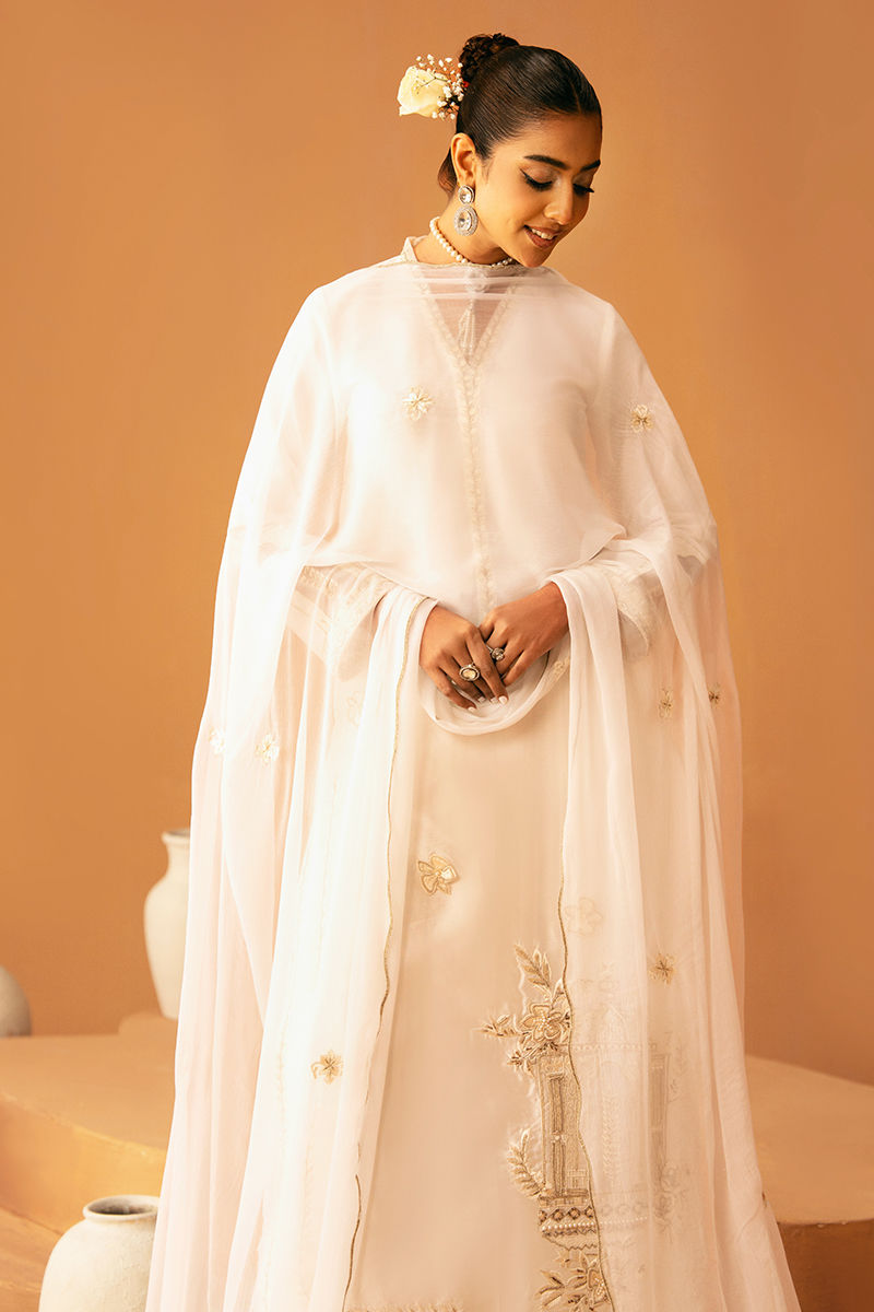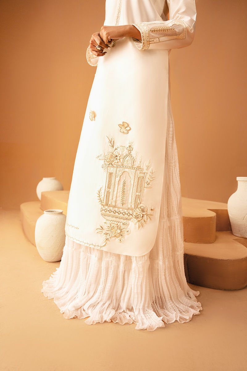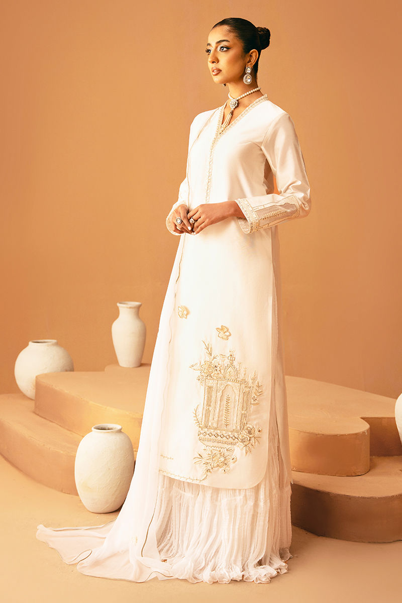 Crafted in luxurious pure silk, this elegant white ensemble features a beautifully embroidered and delicately embellished shirt, designed to exude timeless sophistication. Paired with a flowing silk sharara for graceful movement and completed with a coordinating dupatta, the look balances refined craftsmanship with effortless elegance, making it perfect for festive and formal occasions.