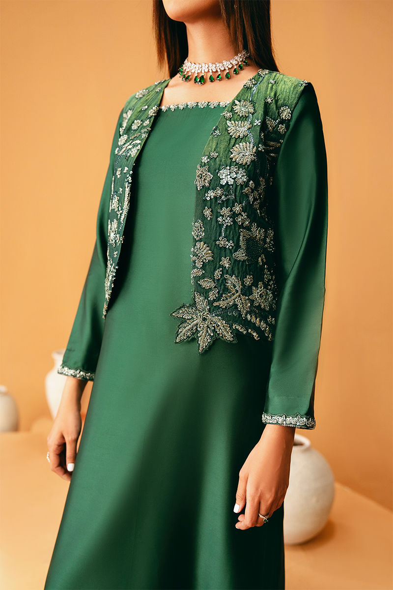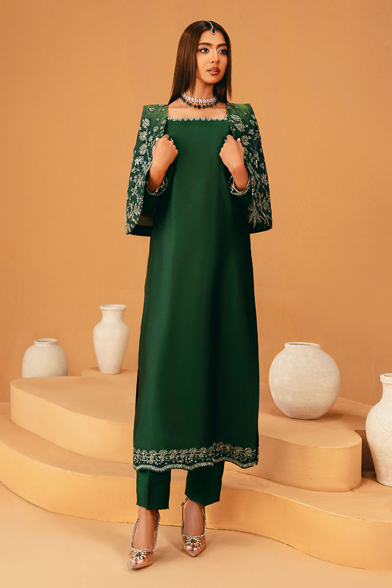 This vibrant green shirt is thoughtfully embellished along the neckline, sleeves, and shirt border, paired with matching trousers for a coordinated, elegant look. The ensemble is completed with a dupatta featuring four-sided piping and subtle spray detailing, adding delicate sophistication. For an elevated statement, a fully embroidered and embellished jacket can be added as an optional layer, transforming the outfit into a luxurious, festive-ready ensemble.