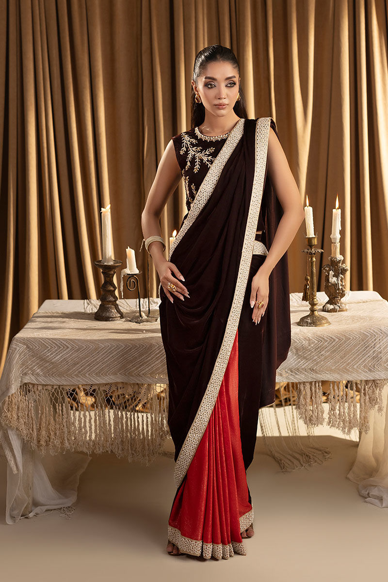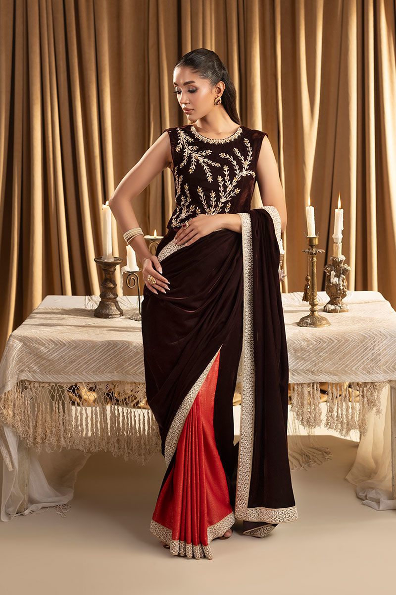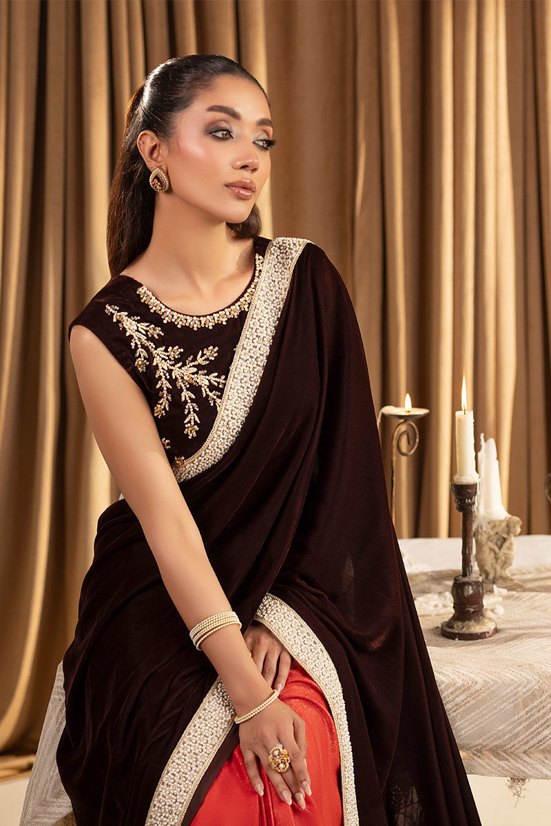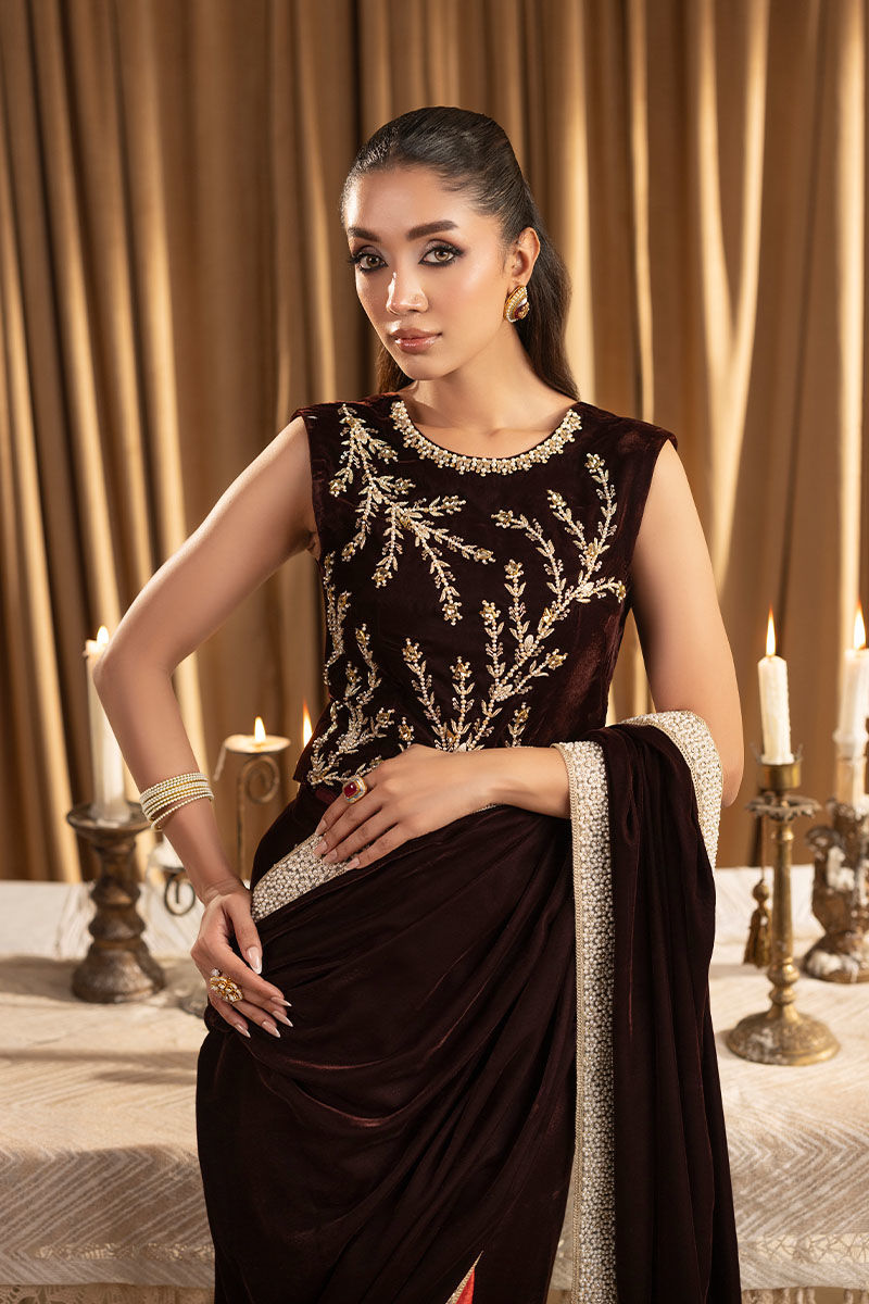 Chocolate hued saree with silky zarri pleats, adorned with dazzling silver pearls work on pallu and light gold adda work on blouse. A fusion of luxe velvet and shimmery silk zarri that's totally Saree Goals for a sophisticated, head turning look.