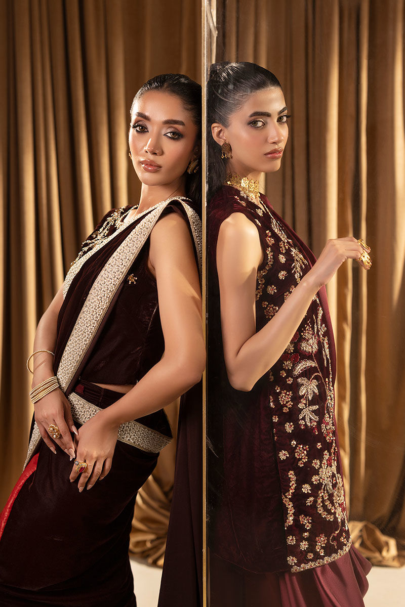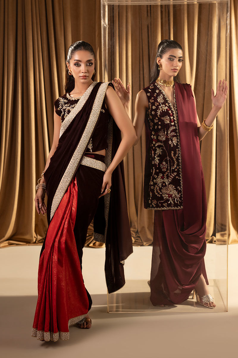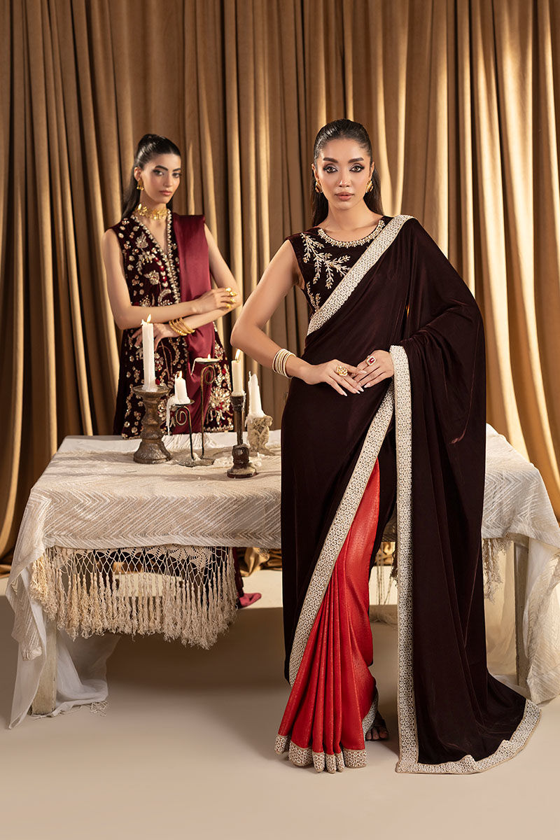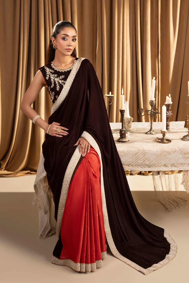 Chocolate hued saree with silky zarri pleats, adorned with dazzling silver pearls work on pallu and light gold adda work on blouse. A fusion of luxe velvet and shimmery silk zarri that's totally Saree Goals for a sophisticated, head turning look.