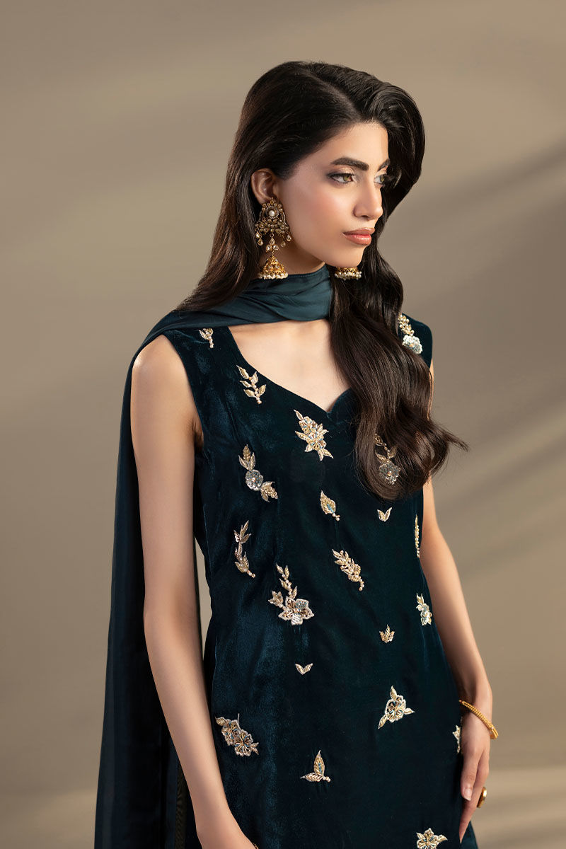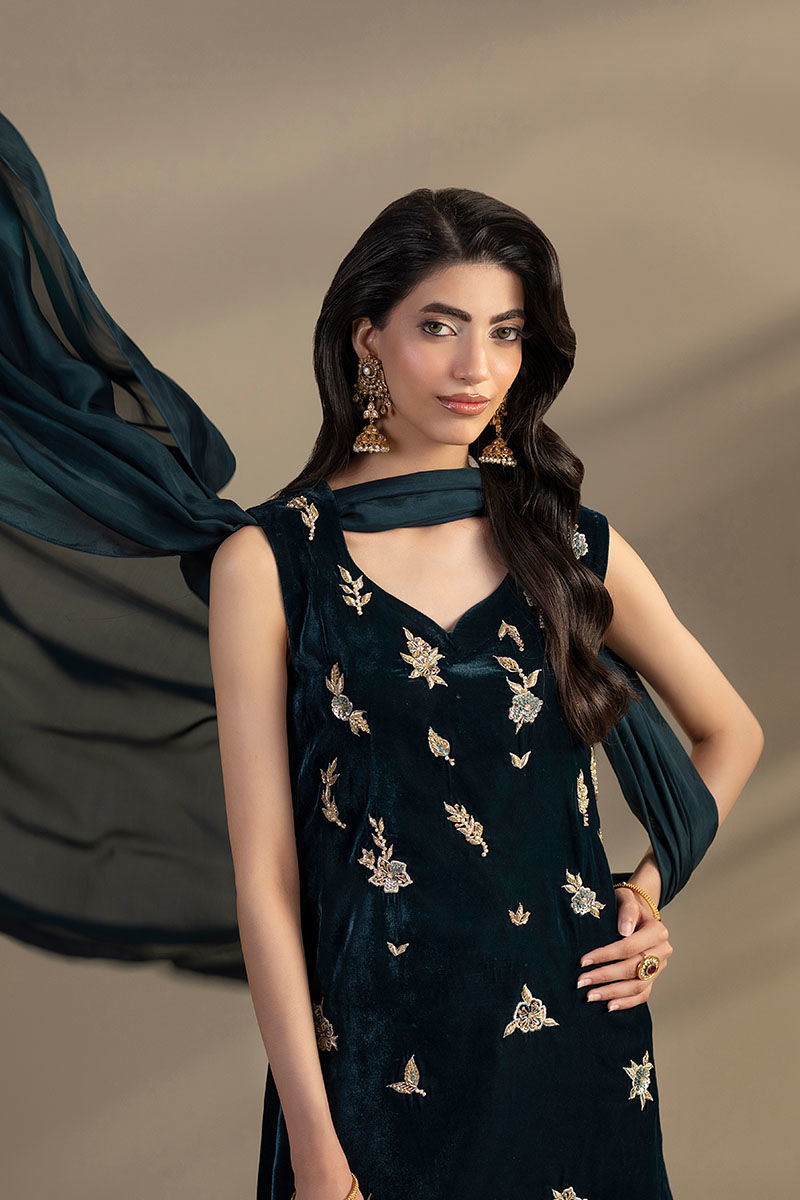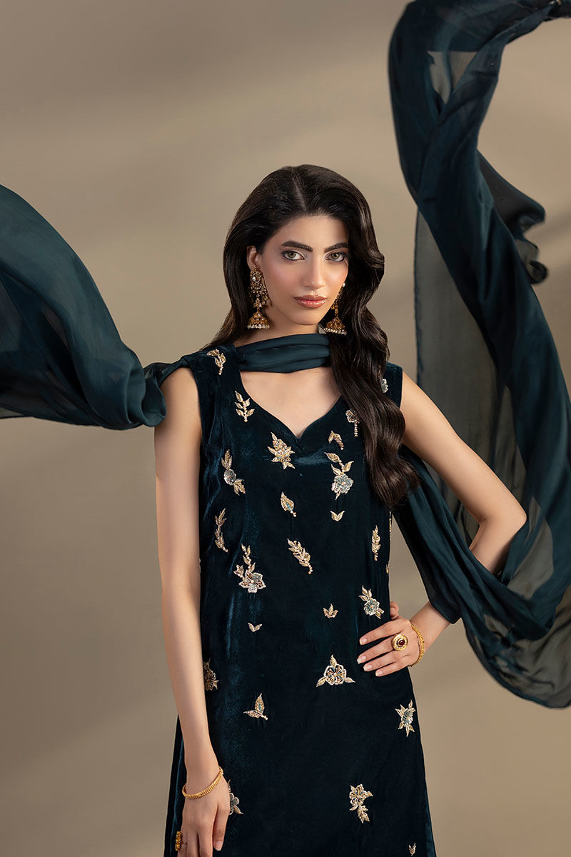 This Teal color outfit consists of a velvet shirt with embroidery and adda work, paired with silk trouser that have lace on the bottom, and silk dupatta with silver gotta patti lines on the pallu