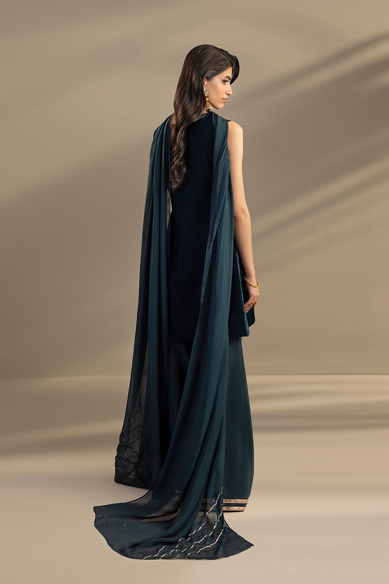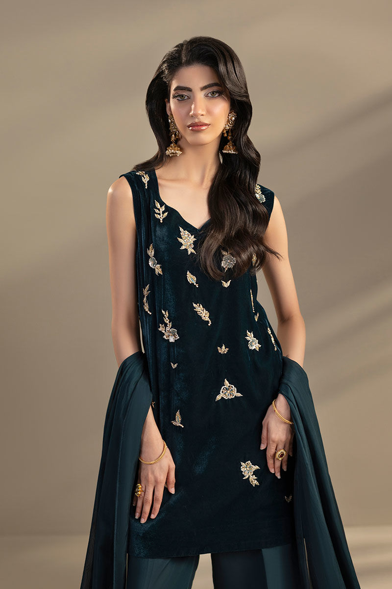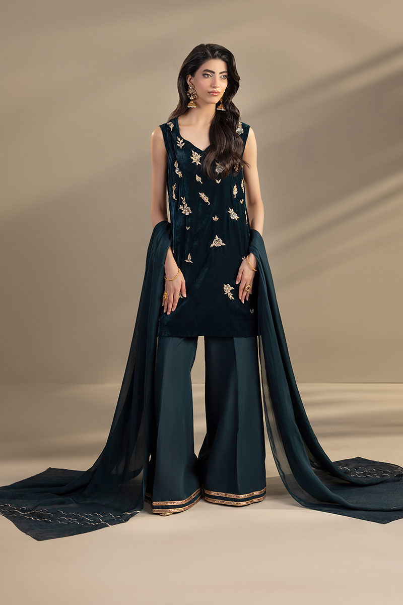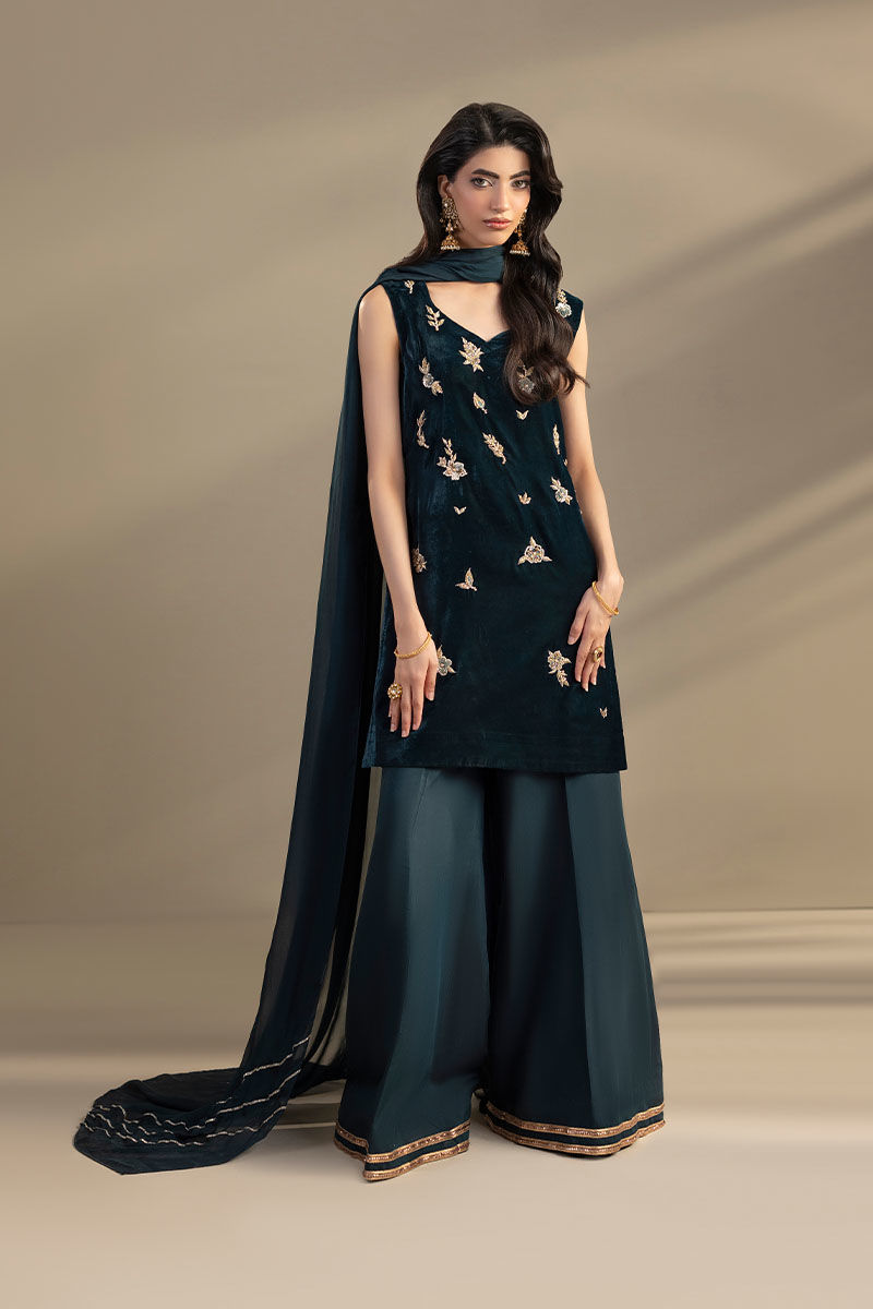 This Teal color outfit consists of a velvet shirt with embroidery and adda work, paired with silk trouser that have lace on the bottom, and silk dupatta with silver gotta patti lines on the pallu