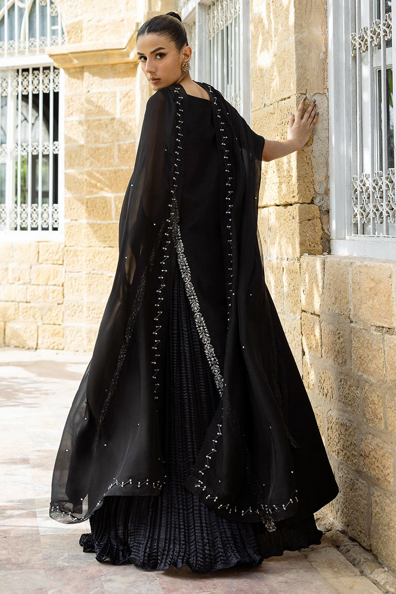 Raw silk shirt meticulously adorned with black & silver hand embellishments; paired with (Opt.01 hand embellished flared silk pants) (Opt.02 flared black crushed pants) (Opt.03 tapered pants with loop button detail). The look is completed with Amur Silk dupatta, gracefully finished with embellished organza border on 4 sides.