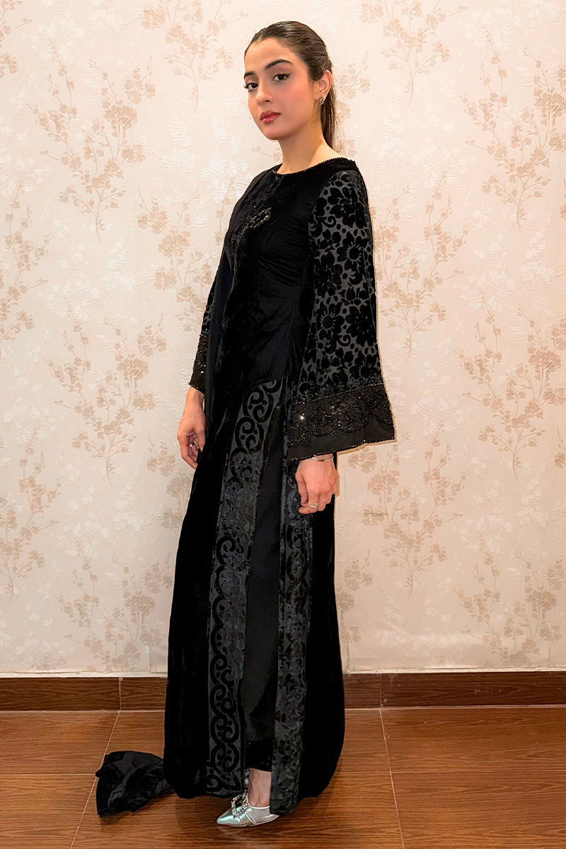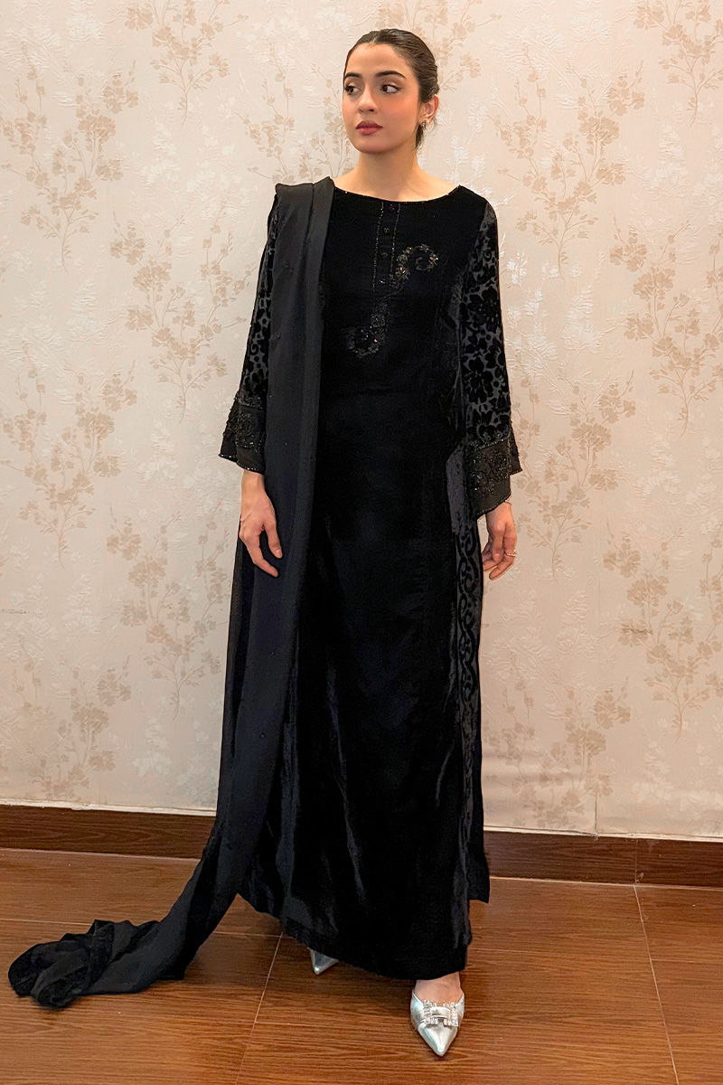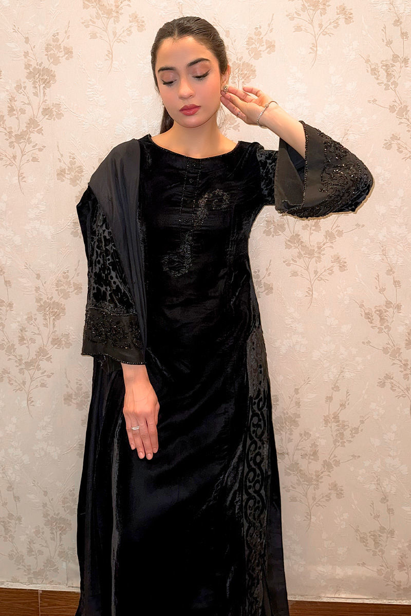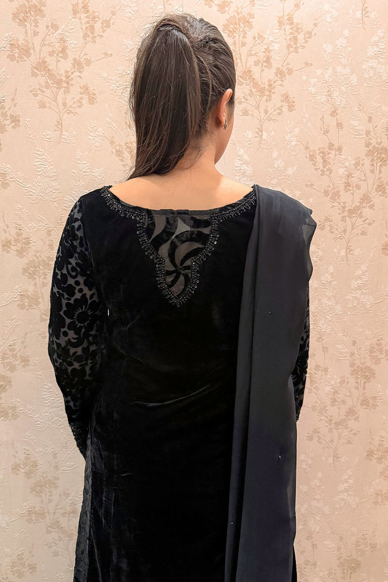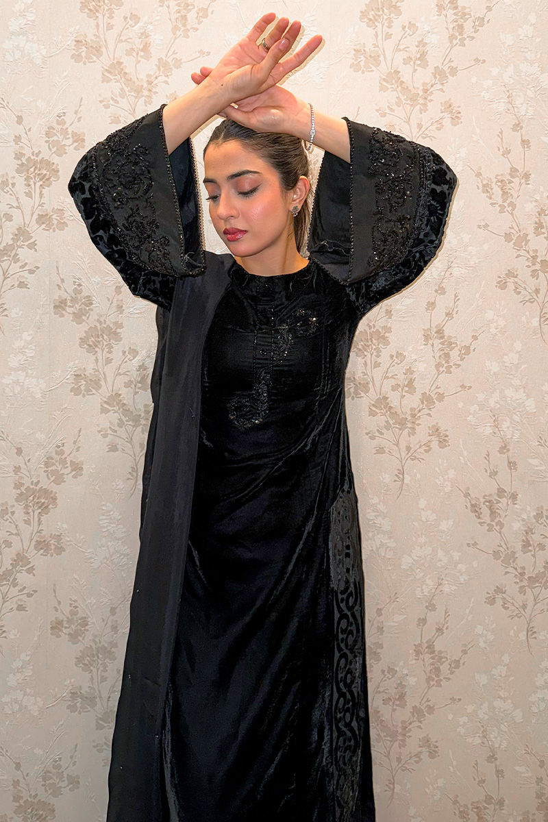 Stunning black outfit with velvet and palachi fabric, featuring heavy adda work on sleeves and neckline also adda work on trouser bottom and on dupatta. Perfect for Eid or special occasions, it'll make you look elegant and sophisticated!