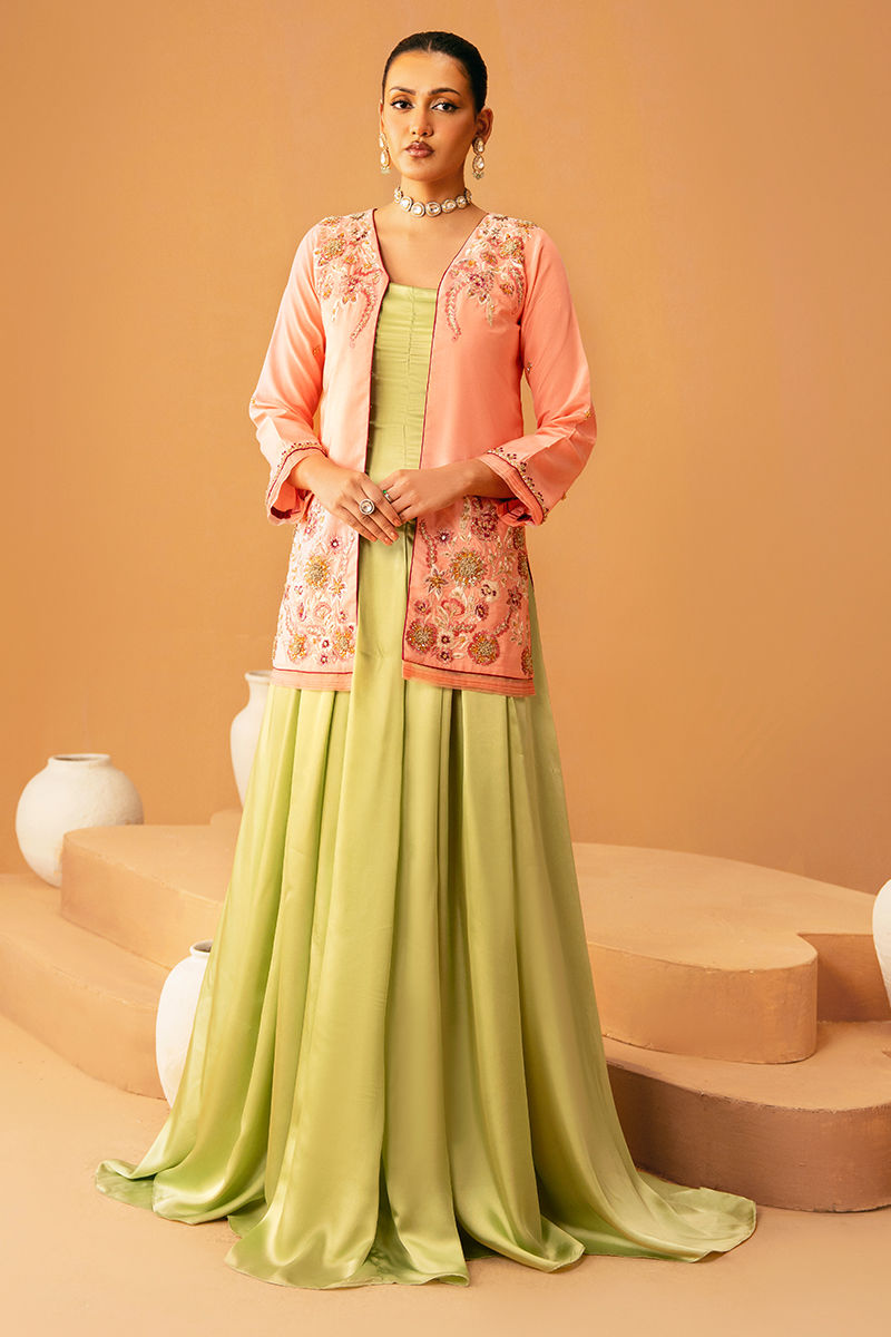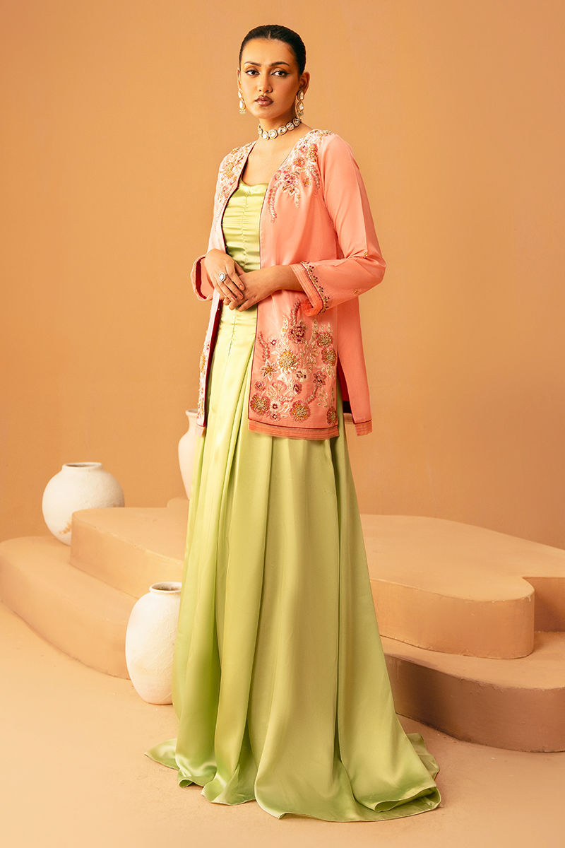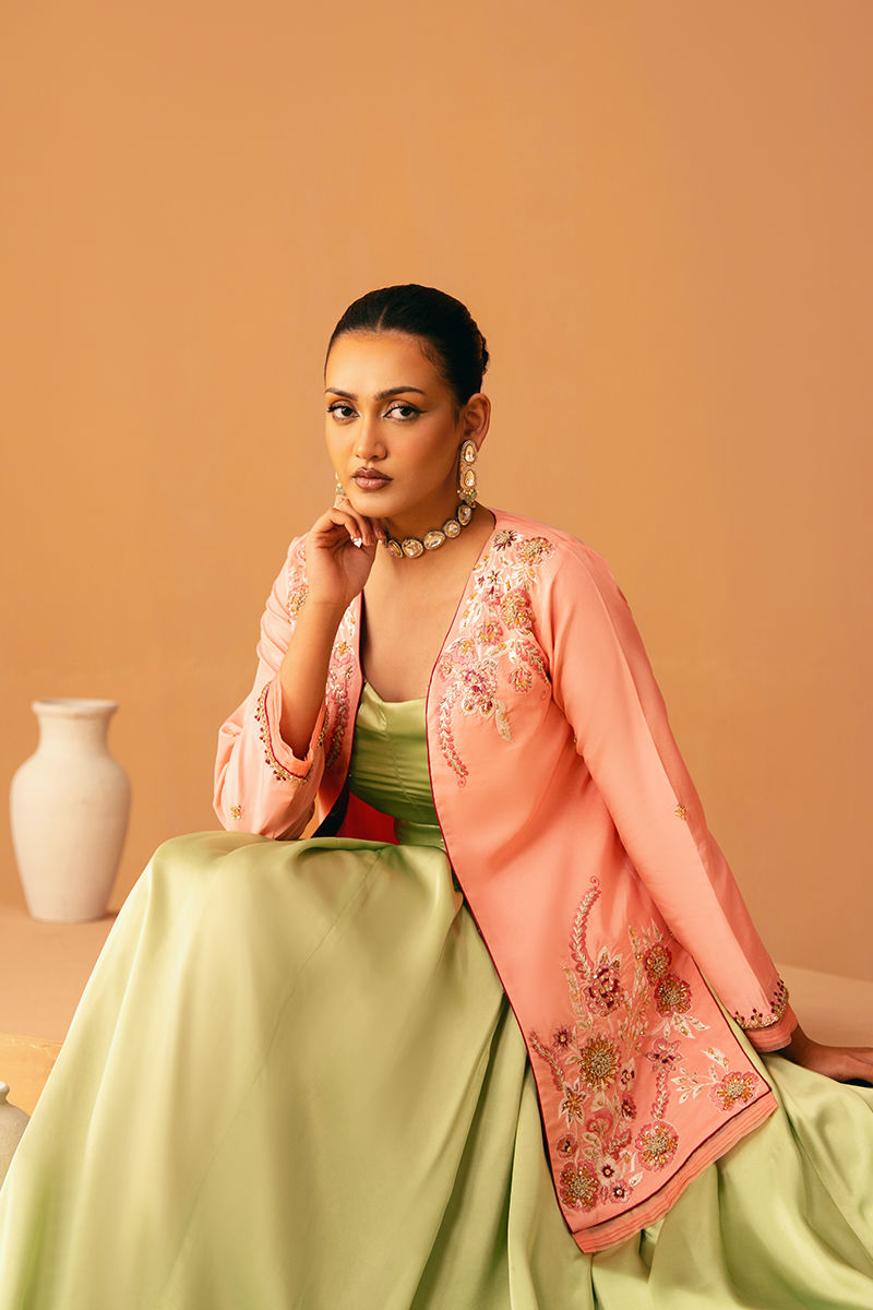 A fresh take on a signature silhouette, this ensemble features a pink jacket crafted from pure Ramen silk, exquisitely embroidered and embellished for a refined statement. It is paired with a contrasting green charmeuse silk sarong, layered over a coordinating charmeuse silk camisole, creating a fluid and contemporary look. Finished with a soft Amur silk scarf, this version offers vibrant elegance with the same timeless craftsmanship.