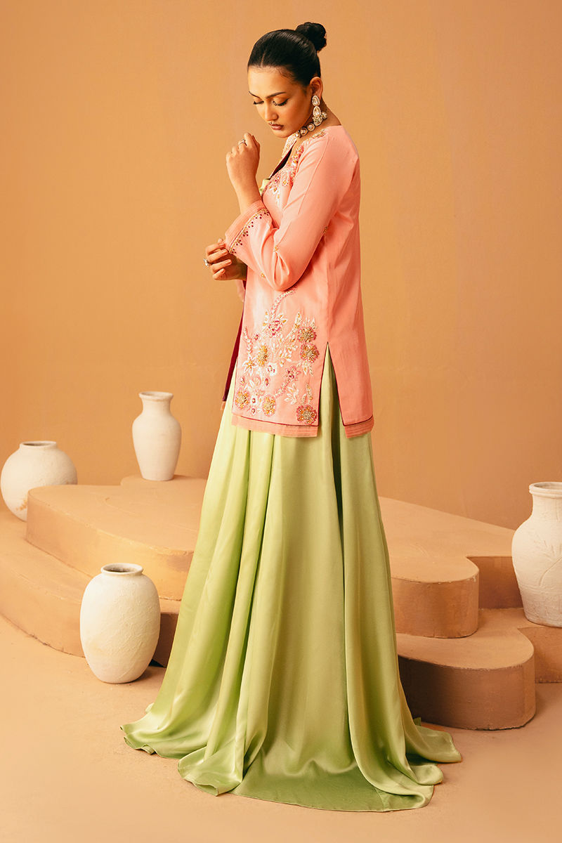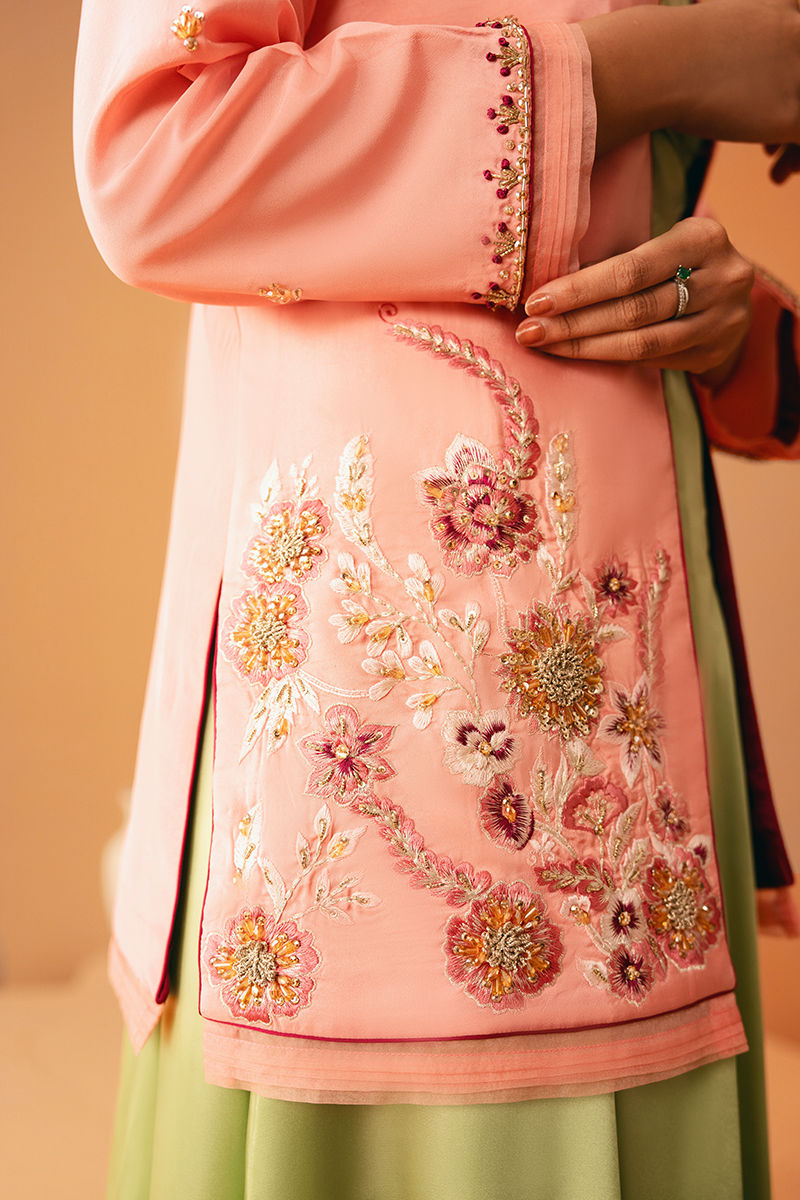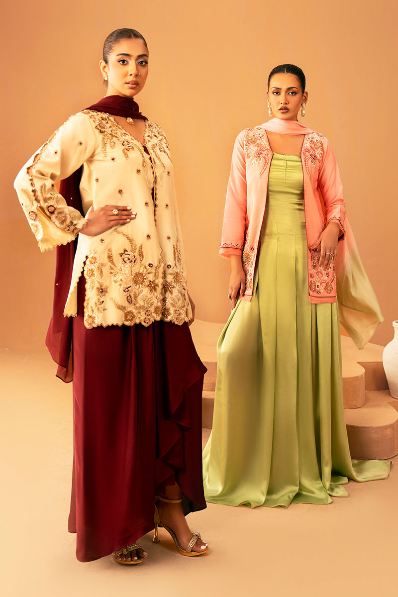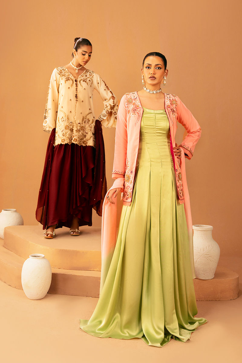 A fresh take on a signature silhouette, this ensemble features a pink jacket crafted from pure Ramen silk, exquisitely embroidered and embellished for a refined statement. It is paired with a contrasting green charmeuse silk sarong, layered over a coordinating charmeuse silk camisole, creating a fluid and contemporary look. Finished with a soft Amur silk scarf, this version offers vibrant elegance with the same timeless craftsmanship.