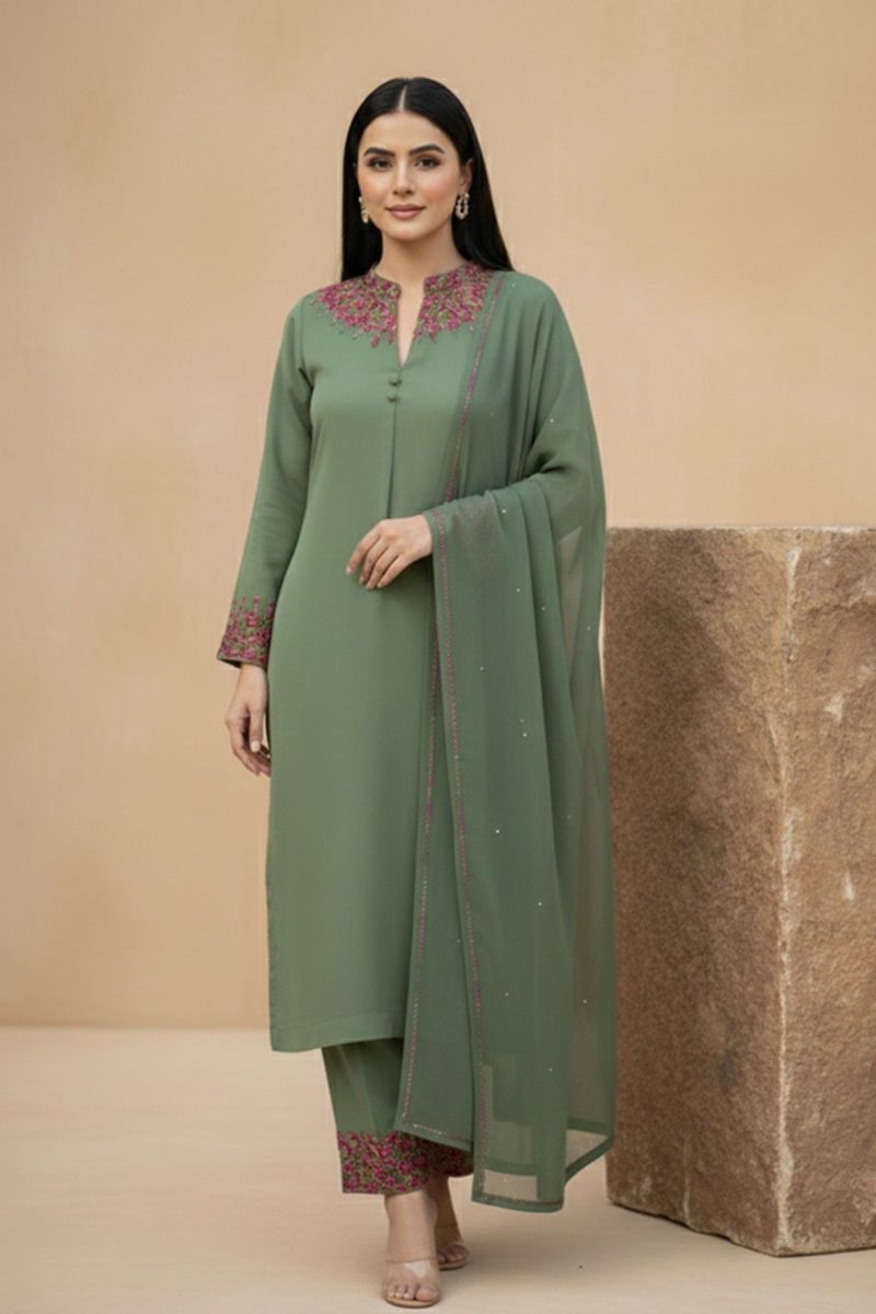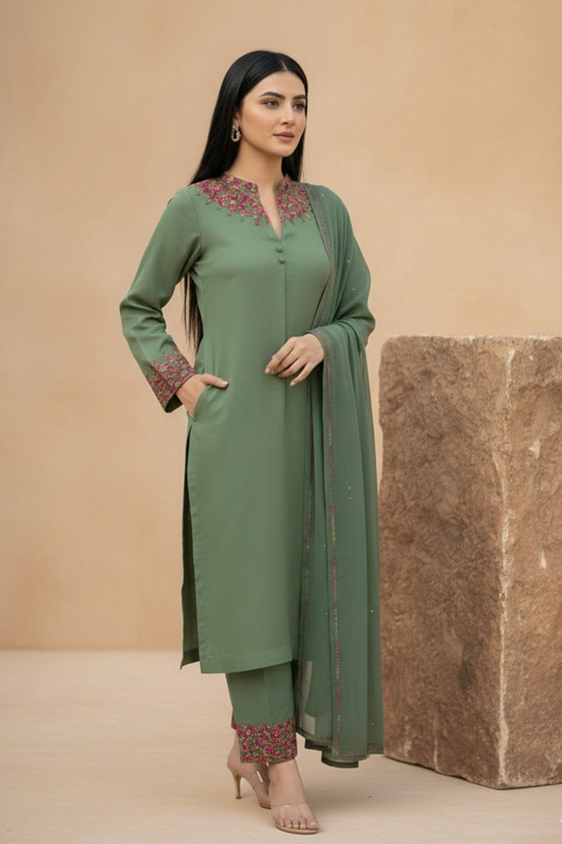 Elevate your winter wardrobe with this exquisite pure wool ensemble, featuring intricate resham embroidery on the neckline and sleeves. The trouser borders are adorned with delicate detailing, while loop buttons on the neckline add a refined, contemporary touch. Completing the look is a crinkle chiffon dupatta with a four-sided border, creating effortless elegance and seasonal sophistication.