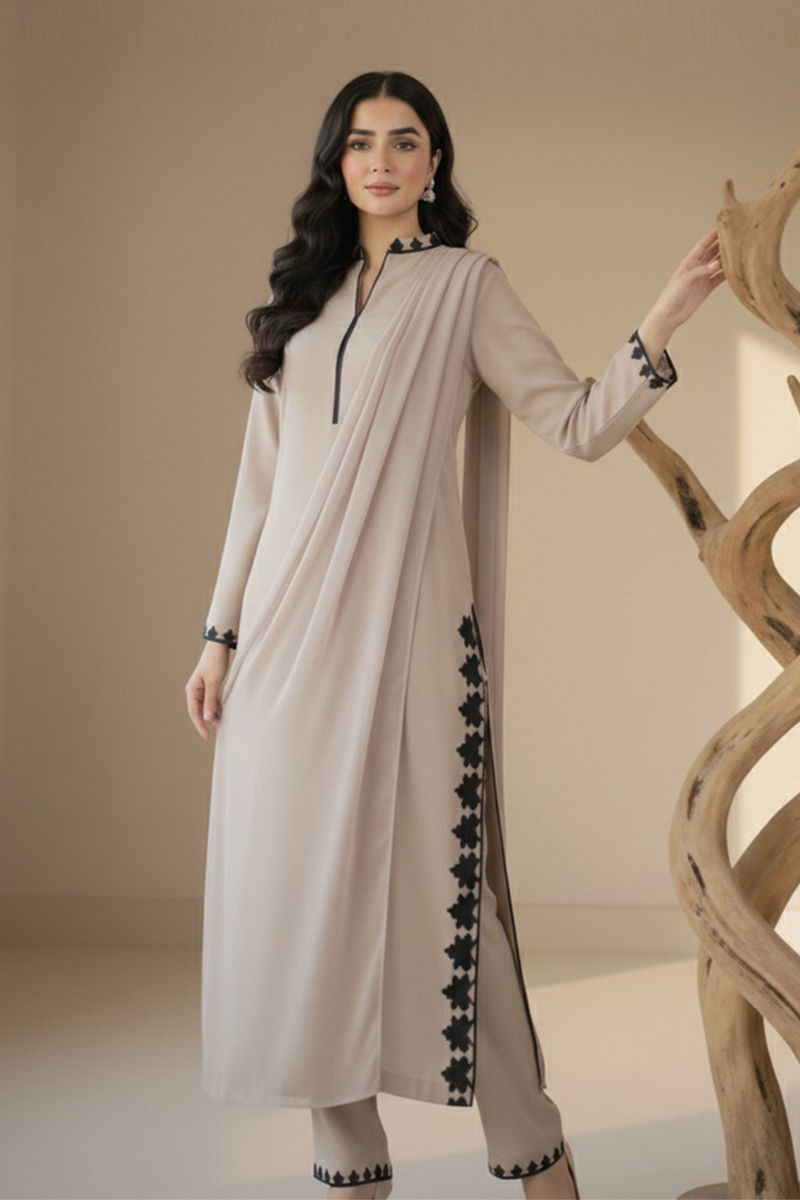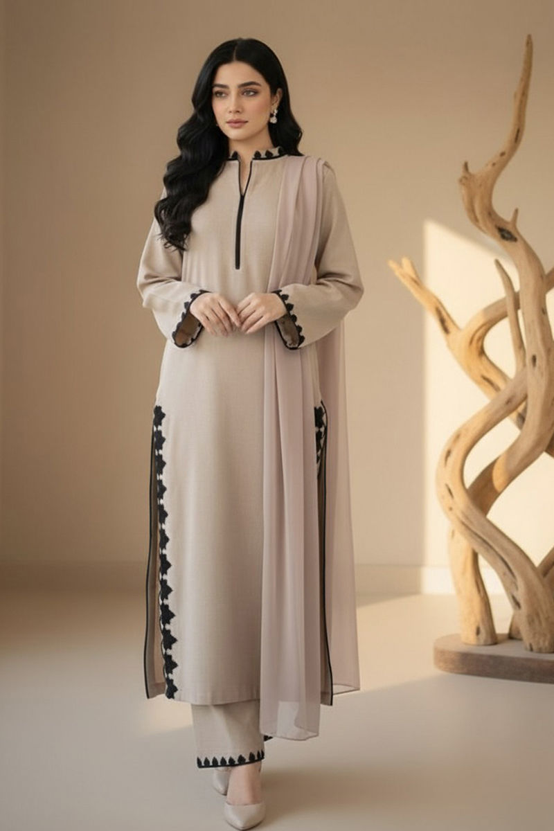 Embrace understated elegance with this Karandi 3-piece ensemble, where simplicity meets sophistication. The resham embroidery on the neckline, sleeves, side slits, and trouser borders adds delicate detailing without overpowering the clean silhouette. A medium silk dupatta with a subtle four-sided embroidered border completes the look, offering effortless grace - Perfect for those who appreciate minimal luxury.