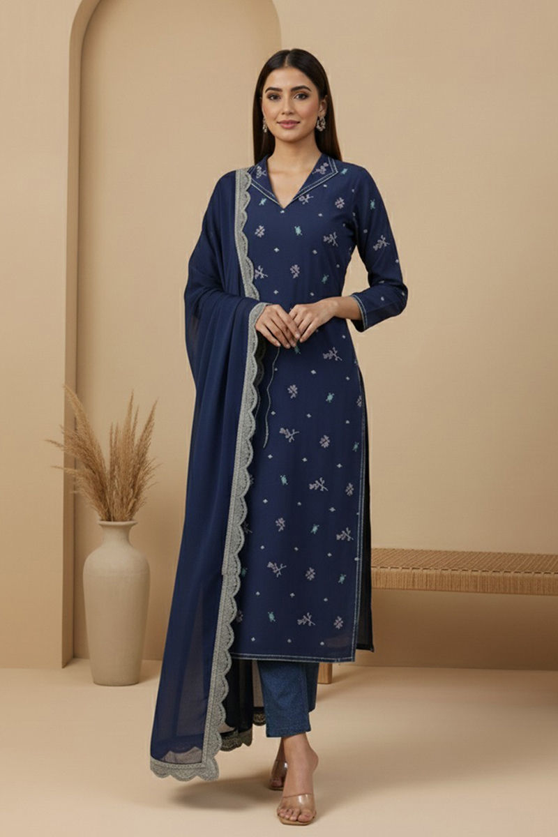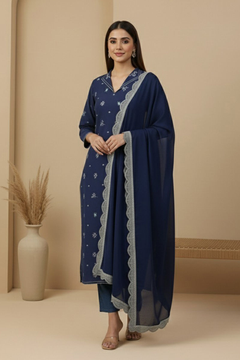 Step into timeless sophistication with this Karandi 3-piece ensemble, where luxury meets comfort. The shirt features full-front resham embroidery, creating an exquisite, statement-ready look. Paired with matching Karandi trousers and a medium silk dupatta with delicate two-sided embroidery - minimalistic yet impactful, it embodies elegance in every detail.