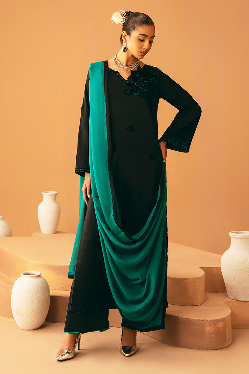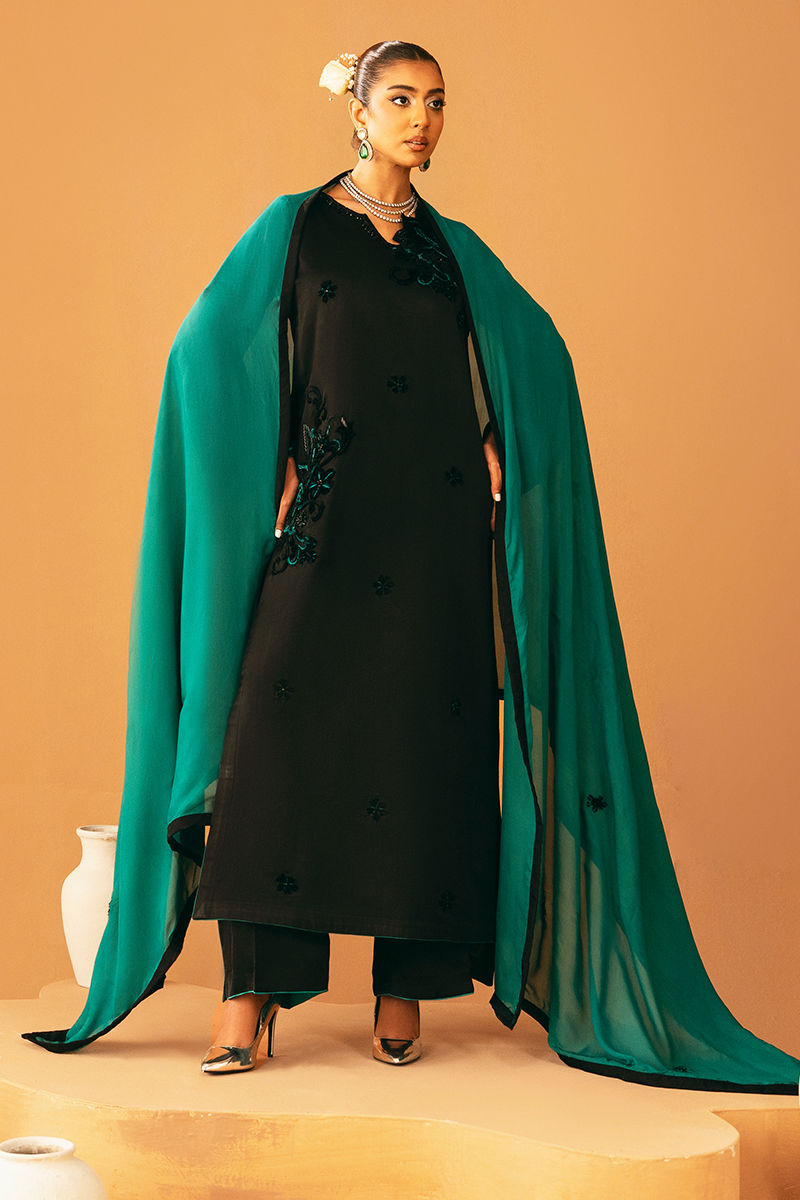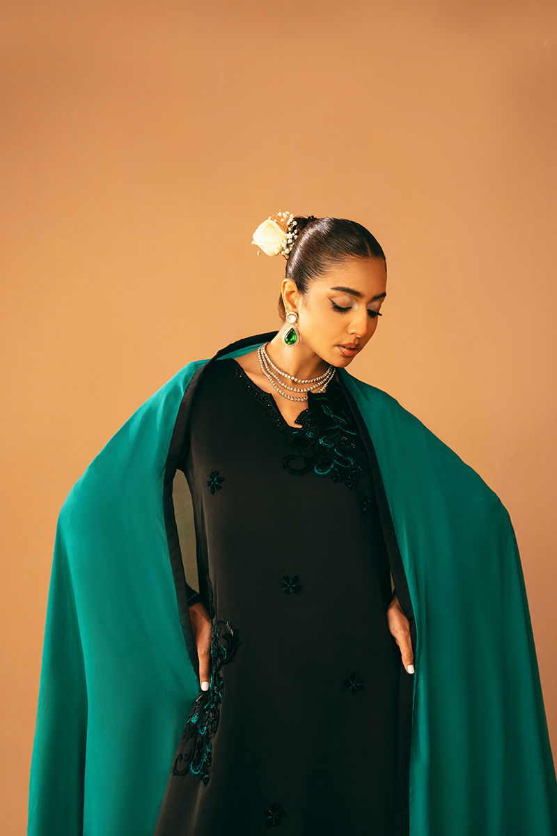 This black shirt is elegantly embroidered and embellished, creating a striking and sophisticated look. It is paired with a plain black trouser for a sleek base, while a contrasting teal dupatta adds a pop of color and graceful movement, perfect for festive and formal occasions.
