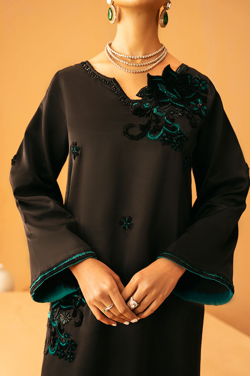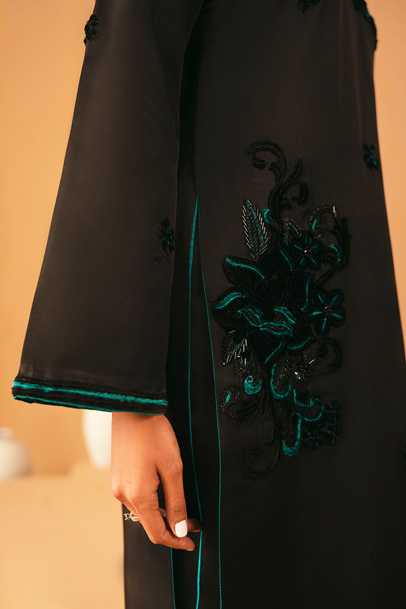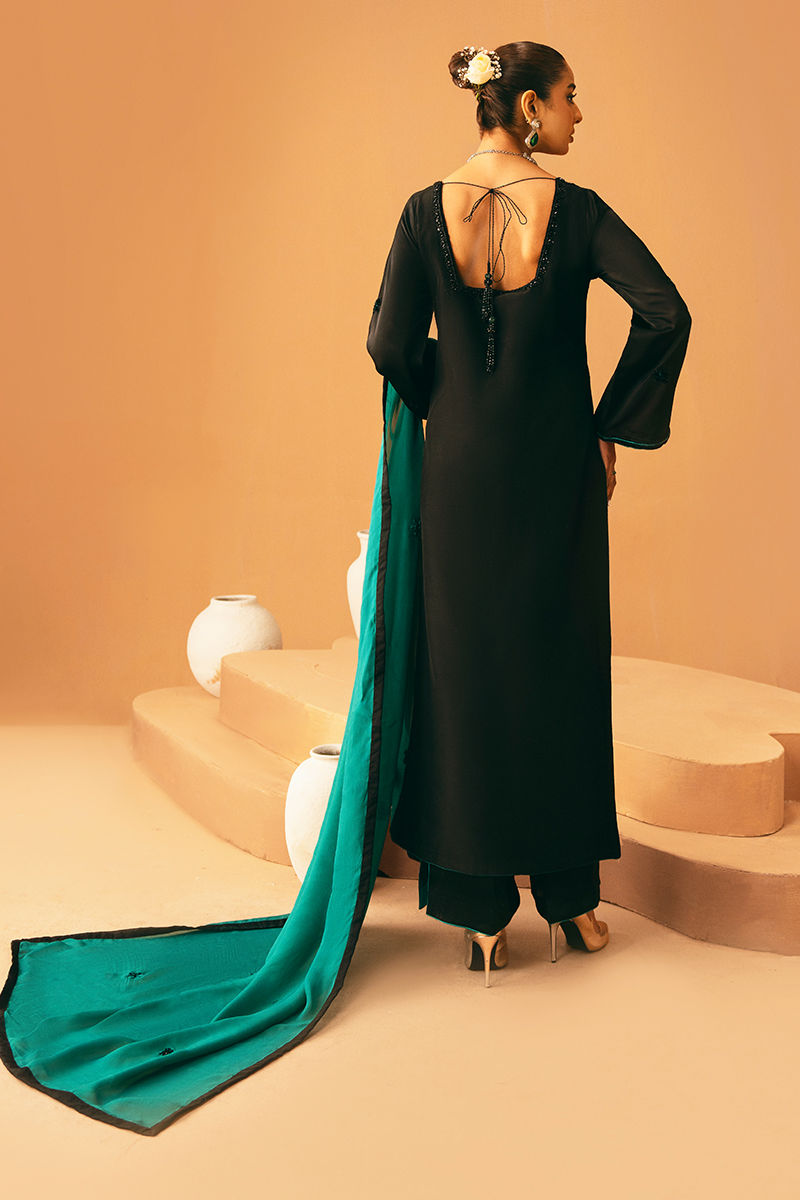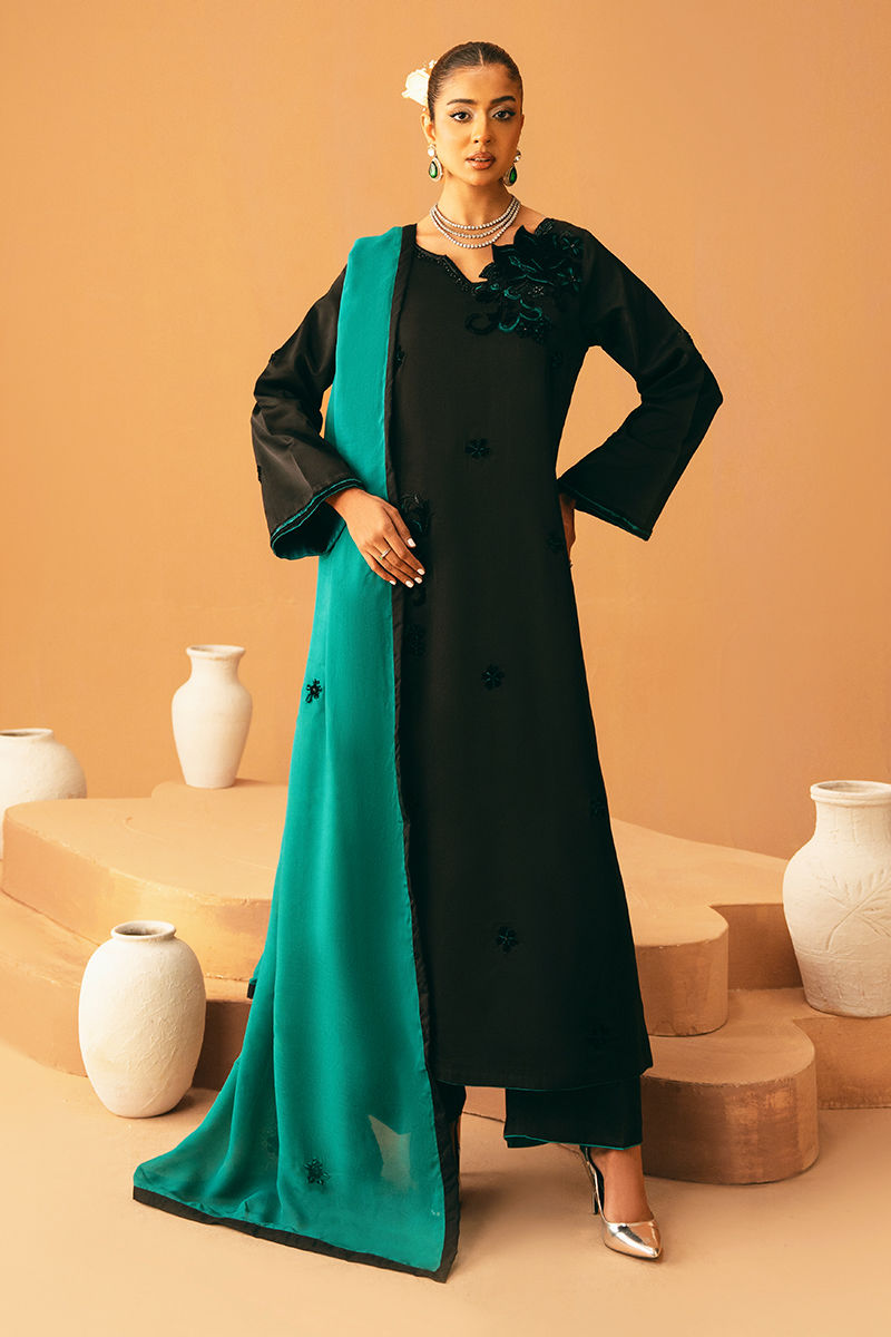 This black shirt is elegantly embroidered and embellished, creating a striking and sophisticated look. It is paired with a plain black trouser for a sleek base, while a contrasting teal dupatta adds a pop of color and graceful movement, perfect for festive and formal occasions.